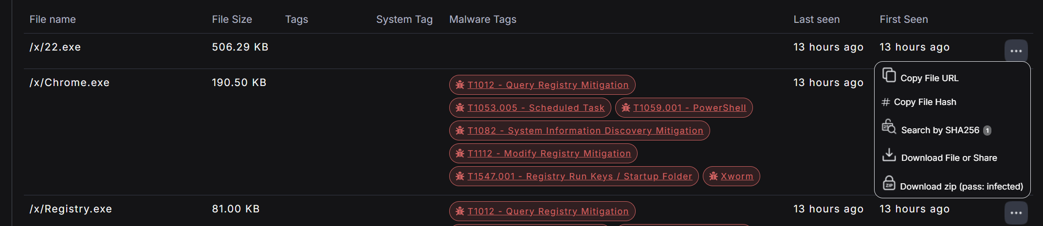 More so, you’ll notice you get a shit ton of tags (sometimes) that nudge you at why these files are potentially malicious. If you click on the three dots to the right, you’ll also get presented a few options of things you can do with those files.
